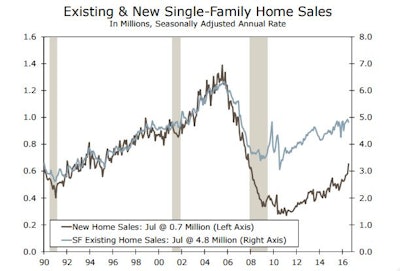 That confidence helped propel July new home sales to a 12.4% jump despite forecasts for decline. The increase lifts sales to pre-recession levels. While month-to-month new home sales can be volatile, sales are up 12% year-to-date.
