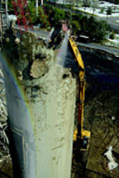 "There is one more remaining structure, a third smokestack that measures out at about 500 feet," he says. "That's even beyond the reach of our crane, so we will construct a ring scaffold and have a crew of six to eight workers, each with a pneumatic jackhammer, start at the top and work their way down. Once we get to the 250-foot level, the crane with the LXP 300 will take over and we'll repeat the process we used on the first two stacks. We already know it's a proven technique, we know that the Genesis attachments will give us the production we need, and we know we will have it done as quickly and safely as possible. That works for me."