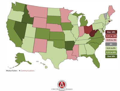 Arkansas (14.9%, 6,800 jobs) added the highest percentage of new construction jobs during the past year, followed by Idaho (13.7%, 4,900 jobs), Nevada (10.7%, 6,800 jobs), Washington and Michigan.