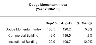 The Dodge Momentum Index moved 5.8% higher in September to 133.5, a seven point increase from its August reading of 126.2. The impetus behind September's gain was a 12% increase from the previous month in institutional building planning.