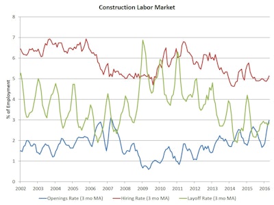 Monthly employment data for May 2016 (the employment count data from the BLS establishment survey are published one month ahead of the JOLTS data) indicate that home builders and remodelers net hiring continued to be weak, as sector employment declined by 4,400, after posting a 5,200 decline in April. These two monthly declines reduced the 6-month moving average of jobs gains for residential construction to 10,000. Declines in multifamily starts may be a factor for the recent sector employment weakness.