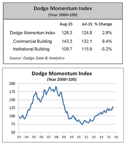 The Dodge Momentum Index increased to 128.3 (2000=100) in August, up 2.8% from its July reading of 124.8, according to Dodge Data & Analytics.