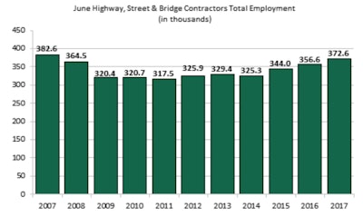 Highway and bridge contractors added 16,000 workers to their payroll in June 2017 compared to June 2016, according to the latest data from the U.S. Bureau of Labor Statistics.