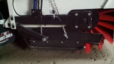 This is why brush bristle is replacing steel as the dirt shoe material of choice for many milling sweeping companies. Instead of using a material like steel that does not yield to impacts, softer, impact friendly materials like brush bristle are being used with great success. A brush bristle dirt shoe consists of a thick row of brush bristle similar to that of a rear sweeping broom. It is mounted where the steel dirt shoes normally are and serve the same purpose, that of keeping millings between the main broom and elevator.
