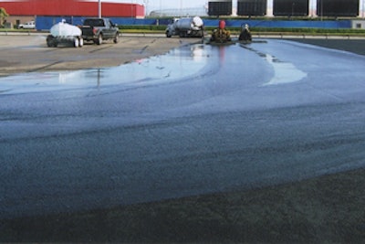 It took the crew two days to black out all the lines, and once the first section of pavement was cleaned and blacked out, the sealcoating process began. And what a process it was. Competitive Asphalt Coatings had five days to apply 80,000 gal. of uncut sealer to 4 million sq. ft. of pavement. Western Colloid dropped two 8,000-gallon tanks of uncut 301 Park Top asphalt-based sealer at the site then was responsible for keeping the tanks filled and moving them as needed.