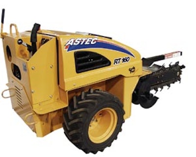 Astec Underground introduces the RT160, a new pedestrian trencher that can trench to 48-in. depth and from 4 to 8 in. wide. Unit is powered by a 24-hp twin-cylinder Honda gasoline engine. Two independent hydraulic pumps control the ground drive and trencher drive of the RT160, which offers a hydraulic trencher drive system directly connected to the trencher head shaft. Tire selection includes standard 23-x-10.5-x-12 tires; optional wider tires or easy-on, easy-off duals are available for improved flotation and traction. Hydrostatic ground drive provides inching precision and infinitely variable speeds for working in different applications and conditions. The RT160 uses an electric start and single-joystick operation, as well as Astec’s unique “automatic parking brake” operator presence system.
